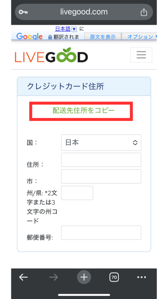 ほとんどの方は配送先住所と同一かと思いますので、「配送先住所をコピー」をタップしてください。
